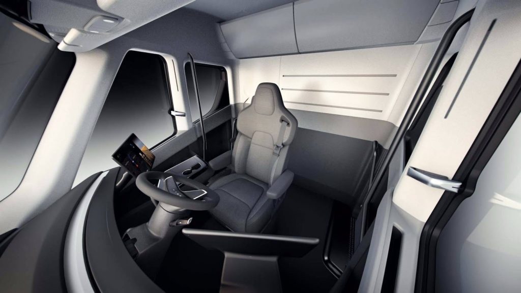 השימוש של טסלה במנועים חשמליים הממוקמים ישירות על הסרנים האחוריים מבטל את הצורך בפרונט ארוך כמו במשאיות האמריקאיות מחד ומייתר את הצורך לשבת מעל למנוע כמו במשאיות האירופאיות ועל כן מאפשר לטסלה לייצר משאית עם פרונט קצרצר ומרחב נדיב במיוחד בקבינה שבחלקים שונים שלה גם אדם בגובה של 1.9 מטרים יכול לעמוד זקוף.