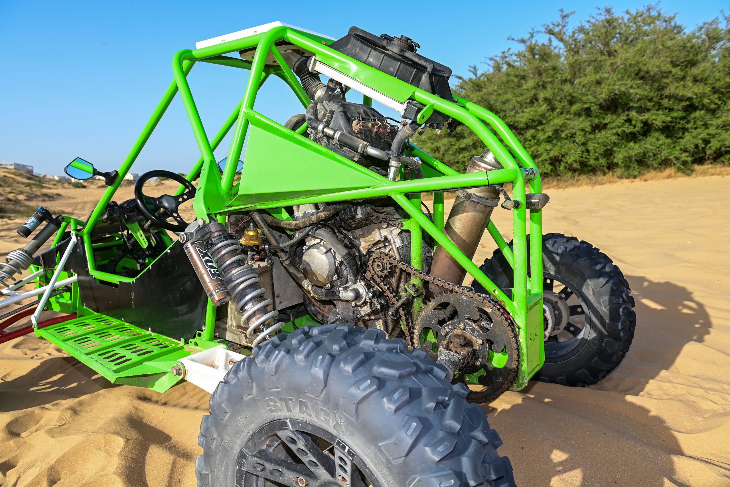 חרטום הבאגי תוכנן ונבנה מאפס, עם מוט הגה, נאבות ומשולשים עליונים ותחתונים שהאריכו את מרווח הגחון, וכך נעשה גם בזנב, לאחר הרחבת מפתח הגלגלים וחיזוק השילדה. הזרועות האחוריות נגררות ומותקנות ציריות אחוריות בעבודת יד, עם צלבים מחוזקים שנוצרו במקור עבור ג'יפ "סופה". גם מיכל הדלק, שמכיל 28 ליטרים, נבנה בעבודת יד מנירוסטה בעובי 2 מילימטרים בהתאם לתקן של ה-FIA, ויש לו תא תחתון נפרד כדי למצות כל טיפת דלק בכל זווית שבה הכלי עשוי להימצא. הקוקפיט עוצב בסגנון מירוצי ראלי עם דוושות תאוצה ובלימה. במקום דוושת מצמד יש ידית לצד ידית ההילוכים, ואלה נשלטות ביד ימין.