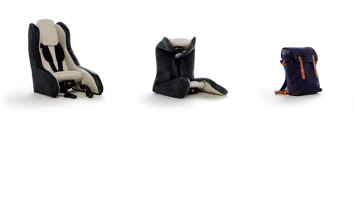 קונספט מושב הבטיחות המתנפח ניתן לקיפול ונשיאה בתוך תיק. פתרון יעיל עבור מי שנוסע בתחבורה ציבורית ועבור סבים וסבתות שלוקחים את הילדים הקטנים לטיול.