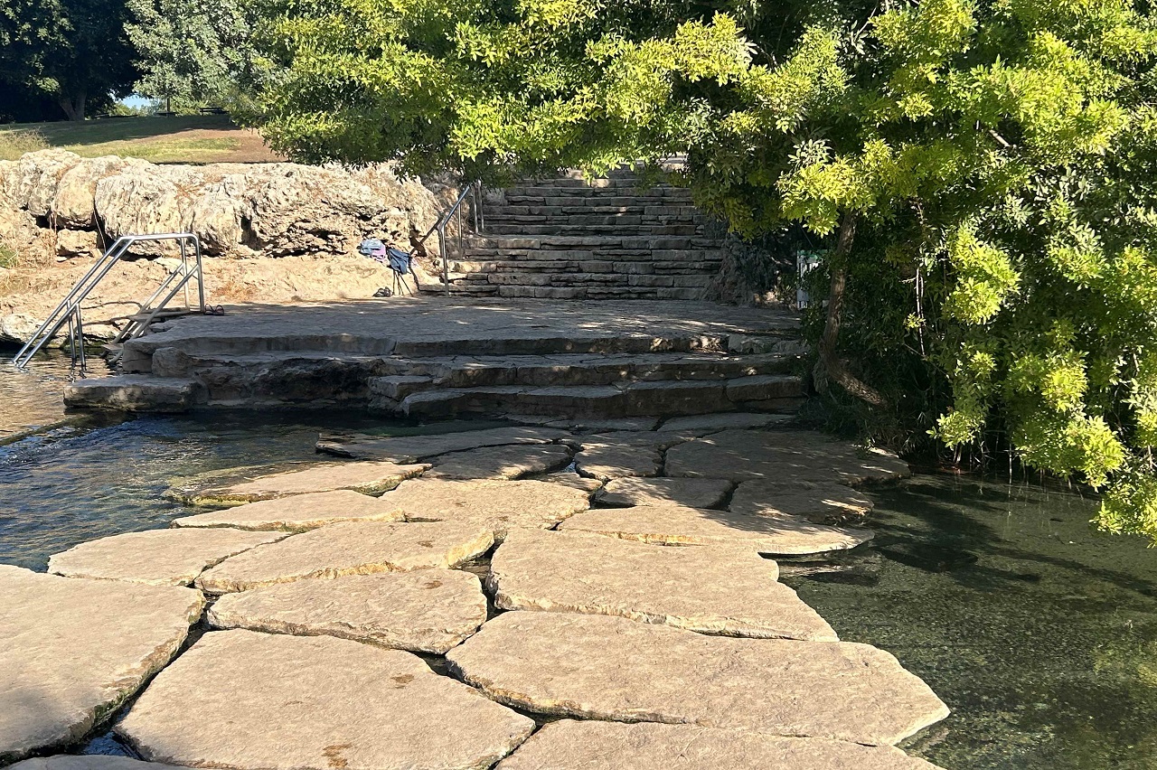 במקטע הערוץ שעובר בתוך גן השלושה המים זורמים וממלאים בריכה גדולה עליונה וממנה ממשיכים הלאה וממלאים בריכה גדולה נוספת, תחתונה. בהמשך זורמים המים בערוץ עד שהם מתנקזים אל אפיק הירדן. בתקופה זאת של השנה, ועד לקראת האביב, הבריכה התחתונה מנוקזת, כלומר שאי אפשר לשחות בה, אבל אפשר להלך בתוכה וזה גם נחמד.
