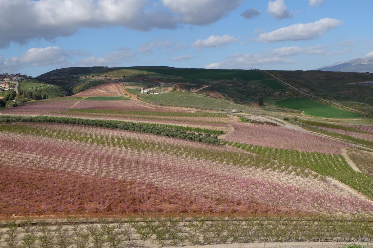 את פריחתה הוורודה של הנקטרינה ופריחות האגס והדובדבן מקשטות מלמטה הפריחות הצבעוניות של כלניות, עיריות ענקיות וצבעונים, וגם כליל החורש מוסיף את פריחתו העדינה לחגיגת היופי הוורוד.