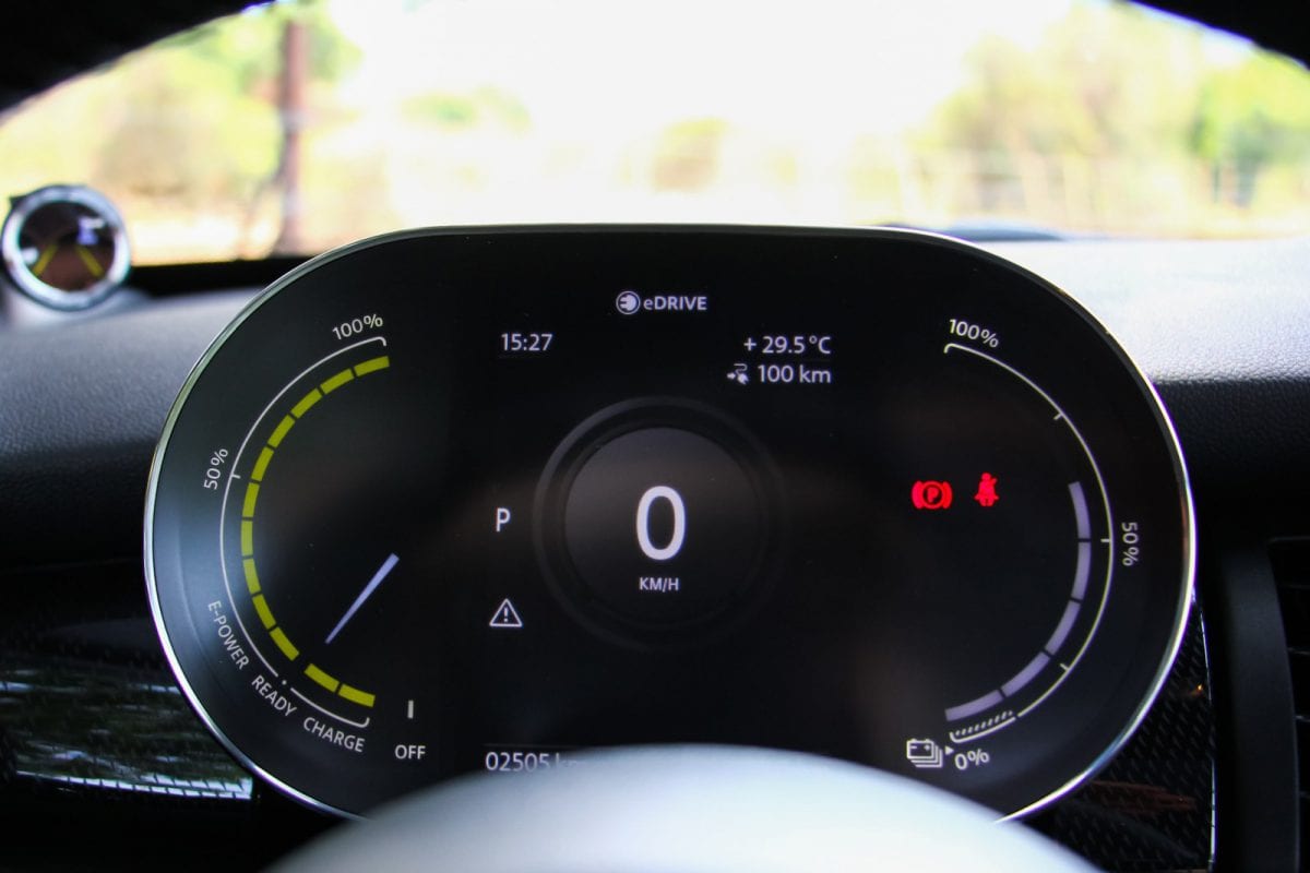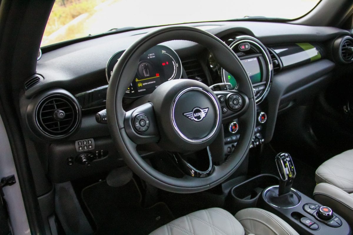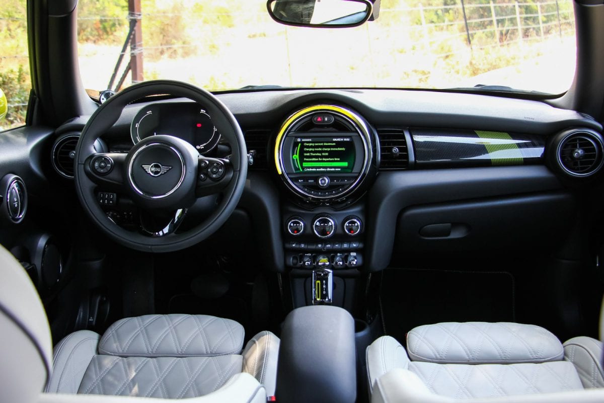 תא הנוסעים לא מאד שונה מזה של גרסת הבנזין, למעט נגיעות קלות והגוון הצהוב – זרחני שמאפיין את הגרסה החשמלית. השינוי המשמעותי יותר הוא לוח מחוונים דיגיטלי מלא שצמוד להגה. חבל שמהנדסי מיני לא מאפשרים לנצל את המסך כדי לאפשר לנהג לבחור בין מספר תצוגות, כמקובל בז'אנר, והמידע שמוצג בסיסי בלבד וכולל מד מהירות במרכז, מד כמות אנרגיה בסוללה מימינו, ומשמאלו מד אנרגיה בשימוש.