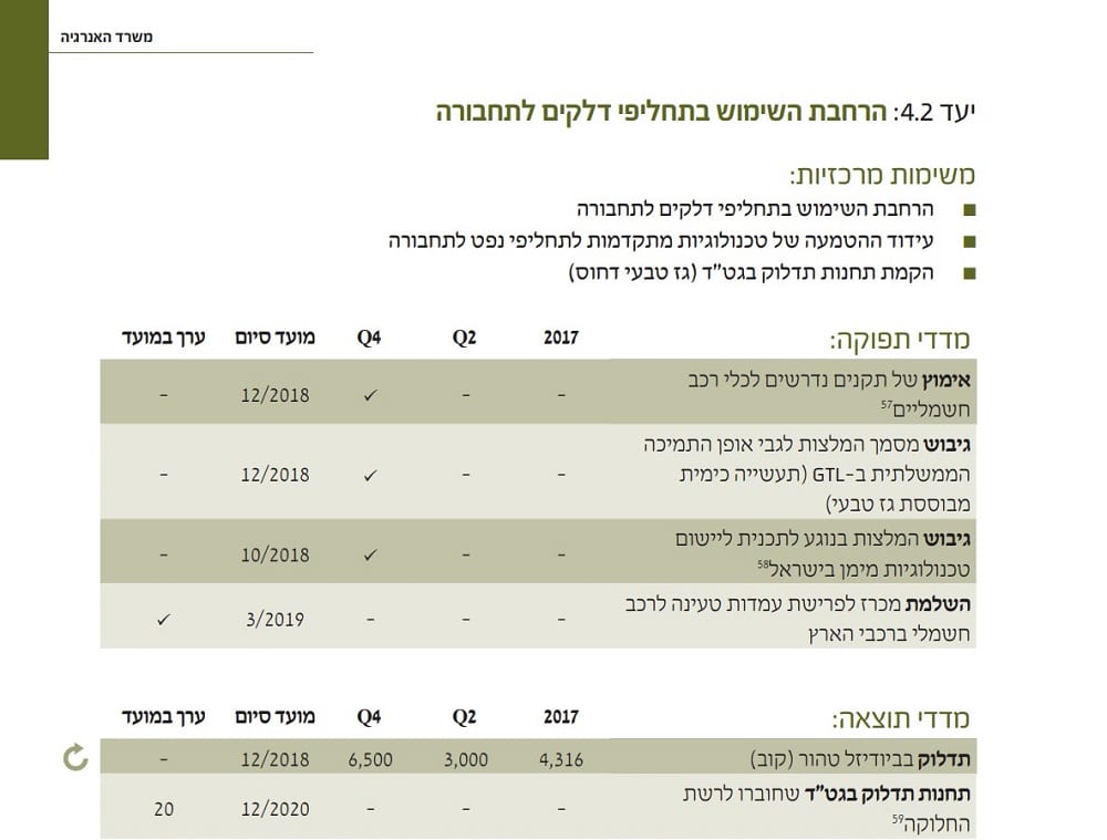 4. "התכנית מציבה יעדים שאפתניים אך מציאותיים, ובראשם: גמילה מלאה ומוחלטת מדלקים מזהמים… היעד בתחום החשמל: 80% גז טבעי ו כ 20% או יותר מתחדשות ב-2030, תוך סגירה סופית של התחנות הפחמיות בחדרה ובאשקלון. היעד בתעשייה: כ-95% מהאנרגיה והקיטור הנדרשים ייוצרו בגז טבעי החל מ-2030. היעד בתחבורה: מעבר הדרגתי למכוניות חשמליות ומשאיות גז טבעי, והטלת איסור מוחלט על יבוא מכוניות בדלקים מזהמים החל מ-2030".