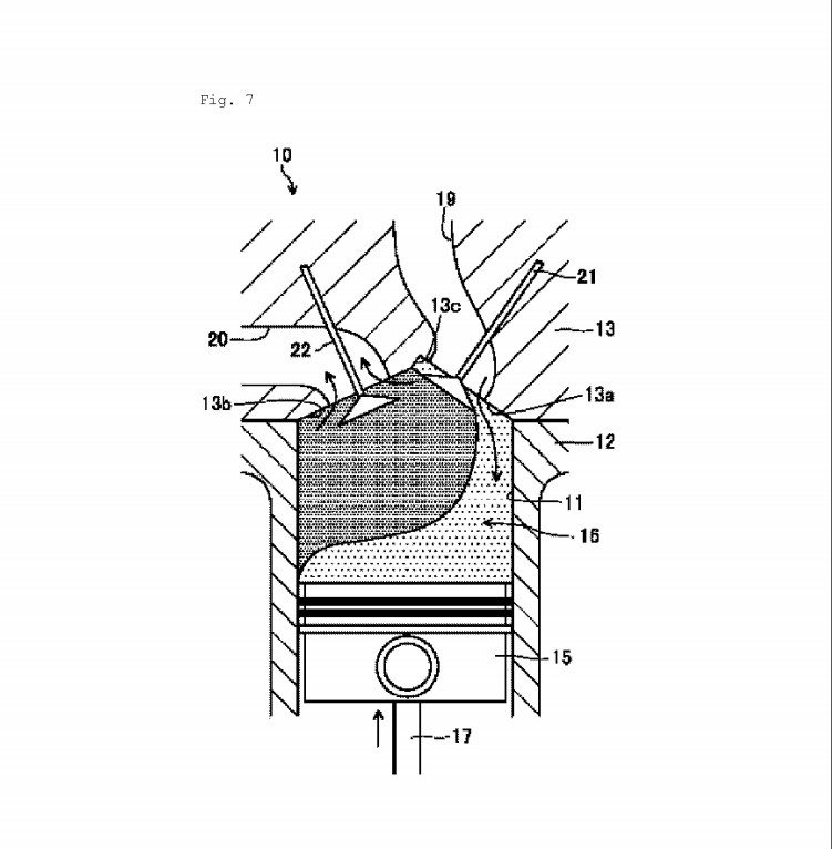 בקשת הפטנט של מאזדה מתארת ​​מנוע דו פעימתי שמסוגל להצית את התערובת שבו גם באמצעות מצת וגם באמצעות לחץ, הוא מוגדש, ויש לו שסתומי יניקה ופליטה שממוקמים במיקום מעט משונה ובזווית של כמעט 90 מעלות זה מזה – קרוב מאוד למרכז העליון של הצילינדר. לפי האיורים נראים שסתומי היניקה ממוקמים בזווית בשעה ששסתומי הפליטה ממורכזים בצד הצילינדר. הזרקת התערובת הישירה מבוצעת באמצעות מזרק דלק שממוקם במרכז ליד המצת בסמוך לחלק העליון של תא הבעירה.
